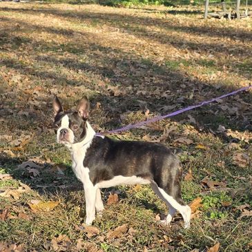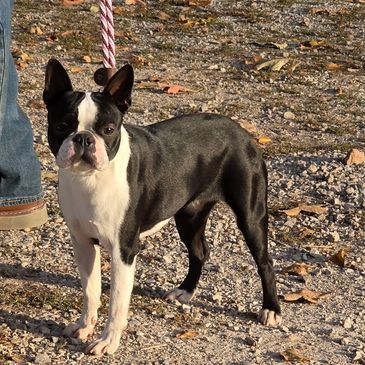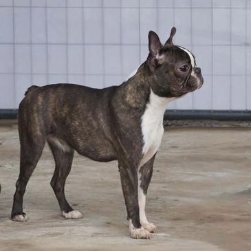 Gipsy is a beautiful brindle female from Romania. She is a absolute sweet girl with that amazing Boston personality. Health testing pending.